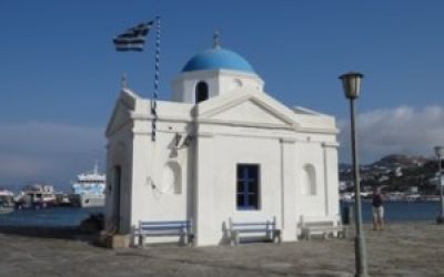 It is a perfect day to sail into Chora, the capital of Mykonos. Blue sky, scattered clouds and a very pleasant 23 degrees. Just like the postcards, the houses are white with blue...